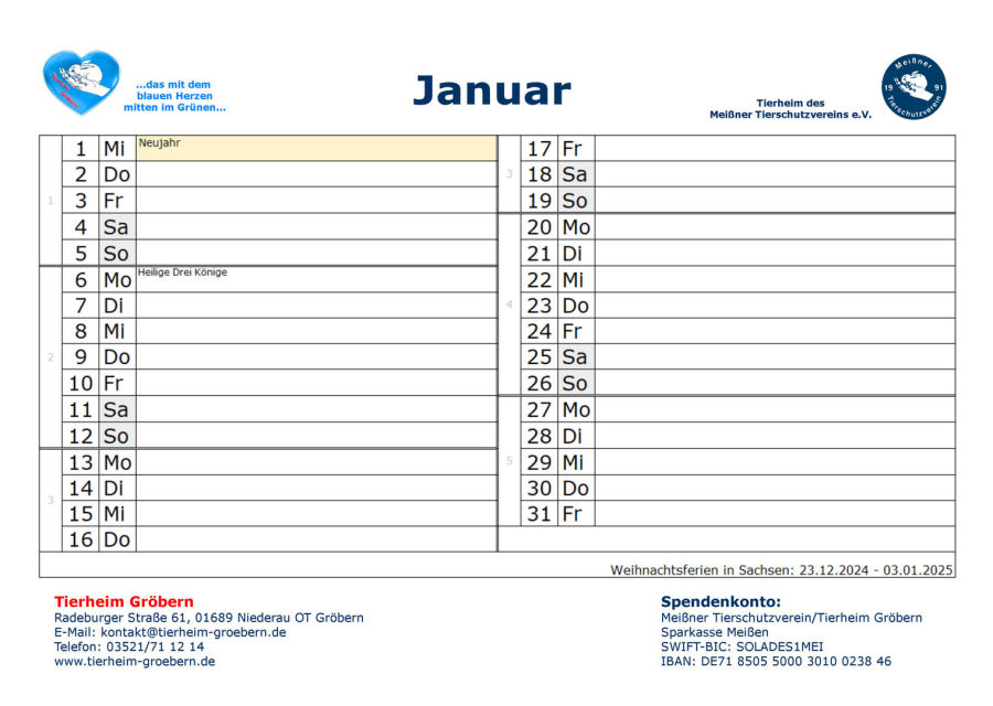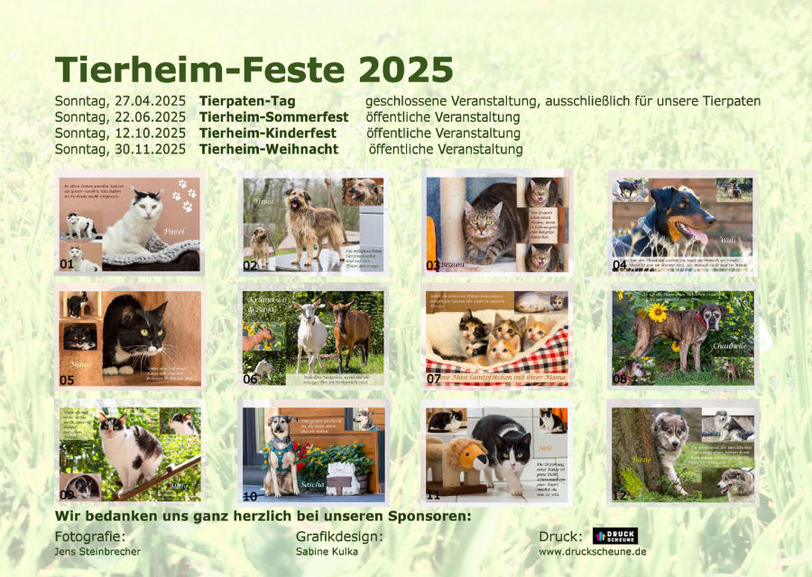 Natürlich kannst du unseren Kalender auch schon bestellen. Wir schicken ihn Dir nach Geldeingang umgehend zu. Du kannst ihn aber auch direkt im Tierheim abholen.