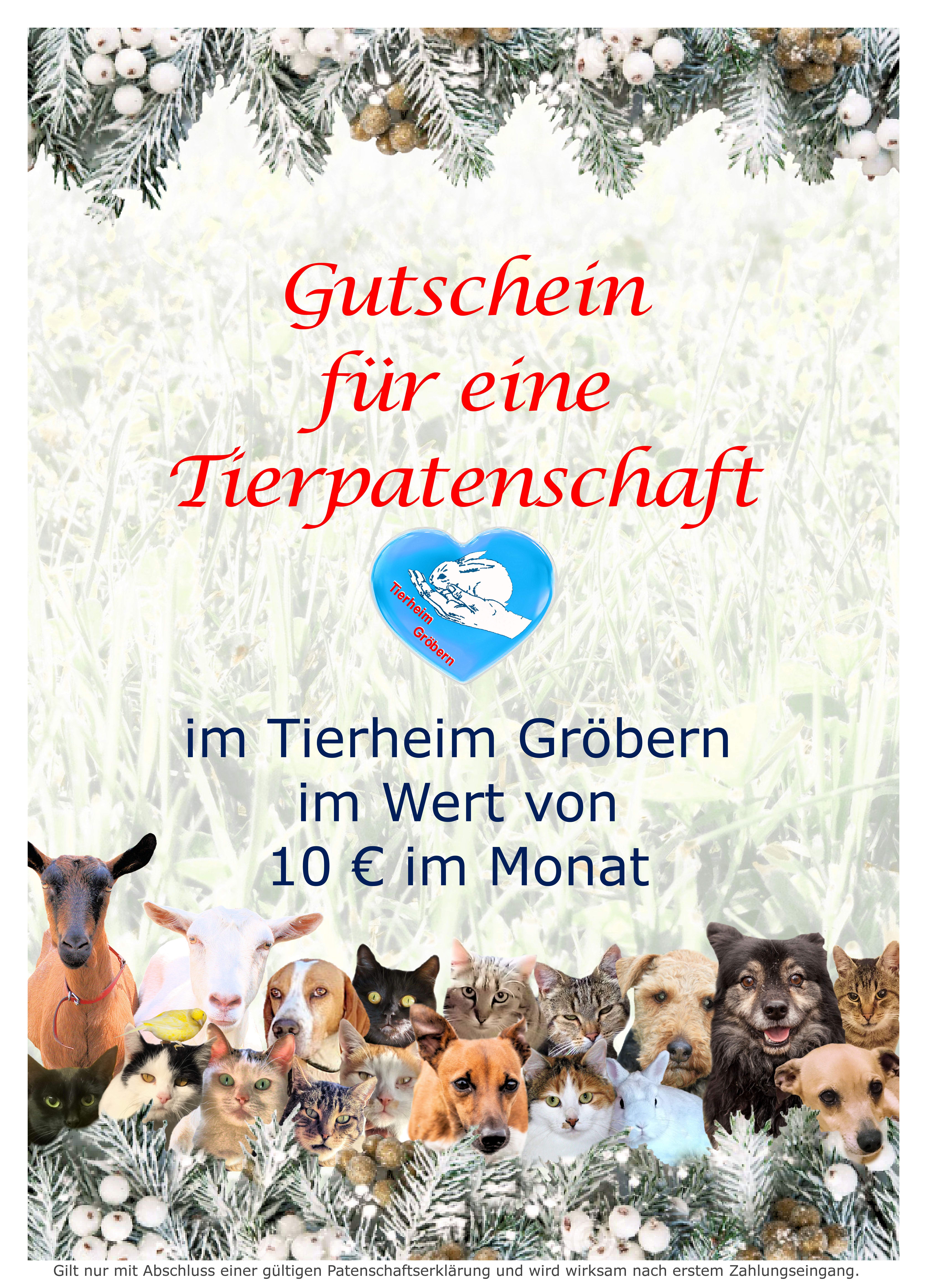Dieser Gutschein erlangt natürlich erst Gültigkeit, wenn eine bezügliche Tierpatenschaft abgeschlossen und der erste Betrag vom Verschenkenden eingegangen ist, wie bei einer normalen Tierpatenschaft auch.